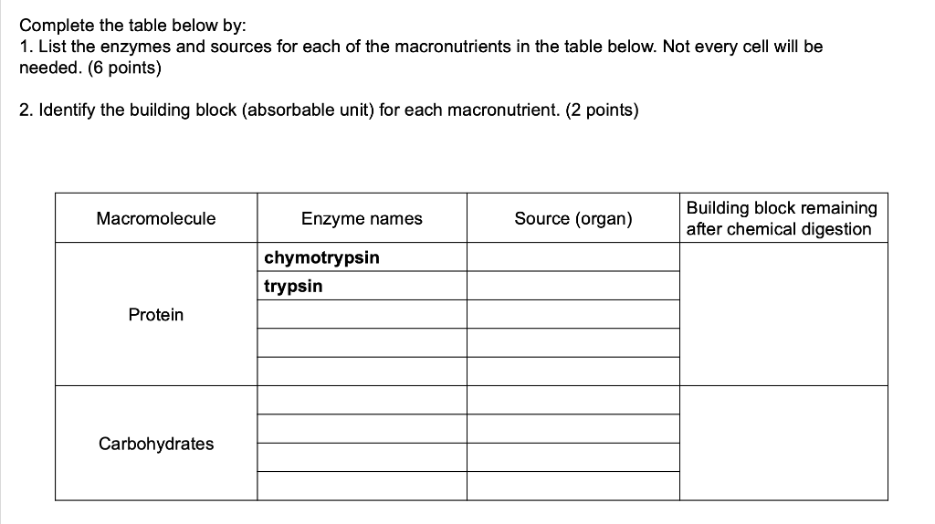 1 poached egg, 1 slice dry toast, 1 cup skim milk, 1/2 grapefruit, 1 large wedge of melon lunch : Macronutrients are defined as a class of chemical compounds which humans consume in relatively large quantities compared to vitamins and minerals, and which provide humans with energy. If a plant is deficient in any of the nutrients—particularly macronutrients—the plant's growth can suffer. Table 3.41 cells involved in the digestive processes in the stomach type of cell secrete neck mucus chief pepsinogen and gastric lipase parieta hcl g gastrin the figure below shows the action of all these different secretions in the stomach. On the table above, the dividing line is typically drawn between s and cl, meaning that: This is the recommended proportion of a person's daily calories that should come from protein, fat, and carbohydrates. The institute of medicine (iom) in its report on dietary intake for energy recommends ranges for proteins, fats and carbohydrates. There are three major macronutrients: Macronutrients (carbohydrates, proteins, fiber, fats and cholesterol, water), phytonutrients (i.e., lycopenes), and vitamins and minerals. Caloric breakdown of macronutrients there are 4 calories per gram in carbohydrates, 4 calories per gram in protein, and 9 calories per gram in fat. Once you complete the macronutrient calculator, you'll get your results instantly. Fat provides 9 calories per gram; To download the summary tables of nrvs for energy, macronutrients and micronutrients, click the link below: